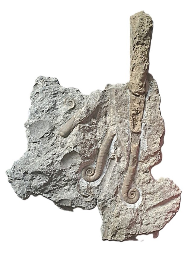 Tonohamites sp. mit Belemnit, 6,2 cm, Unt. Kreide, Walsh River, Queensland, Australien