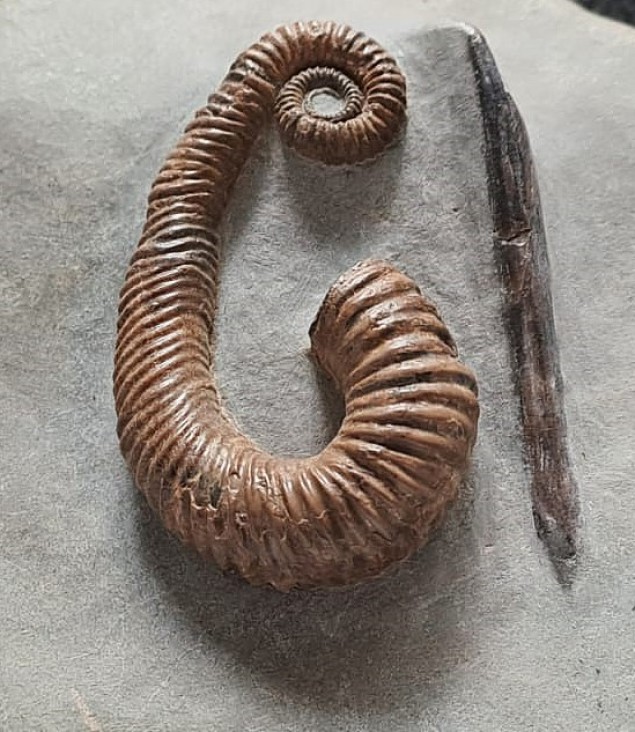 Tonohamites sp. mit Belemnit, 6,2 cm, Unt. Kreide, Walsh River, Queensland, Australien