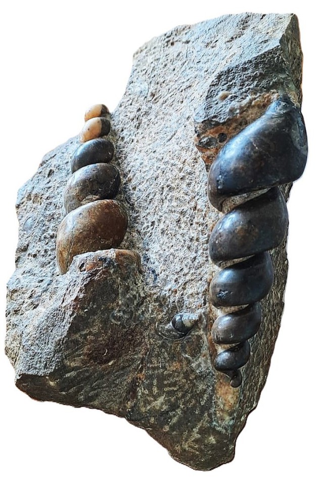Pseudomelania ? heddingtonensis, 1,5 cm, 9,5 und 10 cm, Ob. Jura, Heersumer Schichten b. Hildesheim